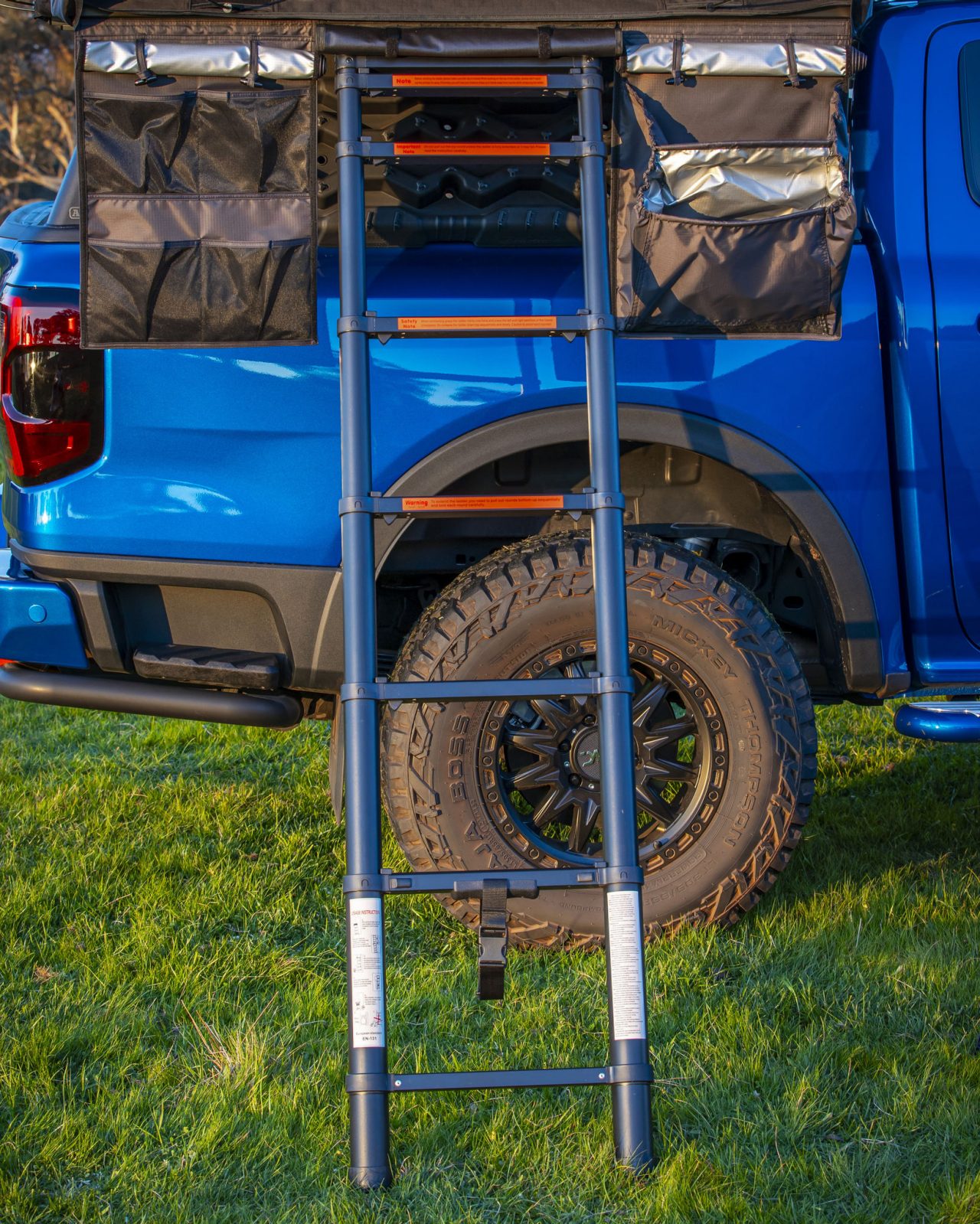 Telescopic ladder—Internally stored telescopic ladder with include ladder cover, now in black finish with angled steps.