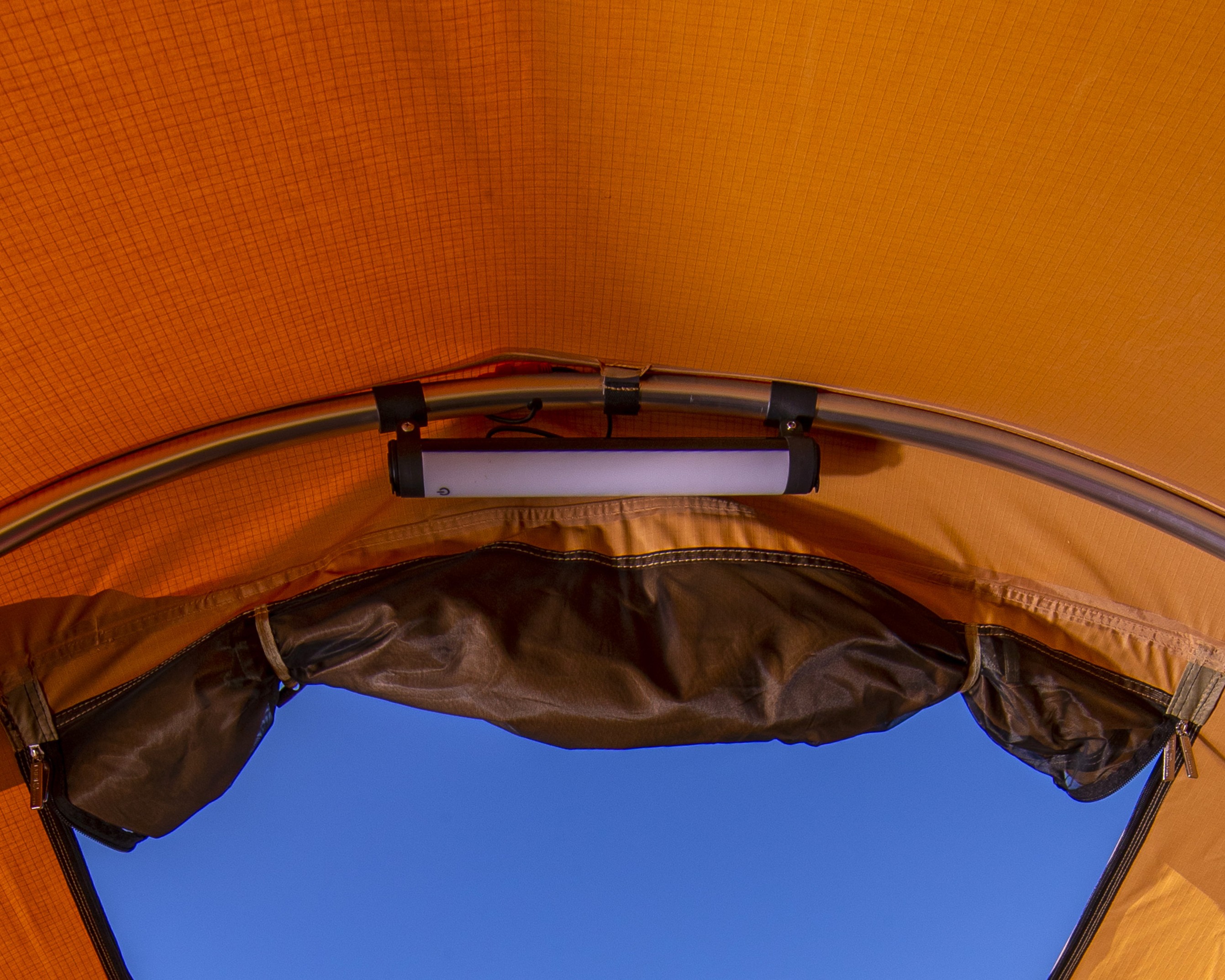 Every detail is considered for your touring comfort. The tent features five zippered windows with midge-proof mesh for optimal ventilation and insect protection, alongside a stargazing skylight for immersive nights. An integrated 12V light with USB charging ports keeps your devices powered and your interior illuminated, delivering a new level of convenience for your remote travels.