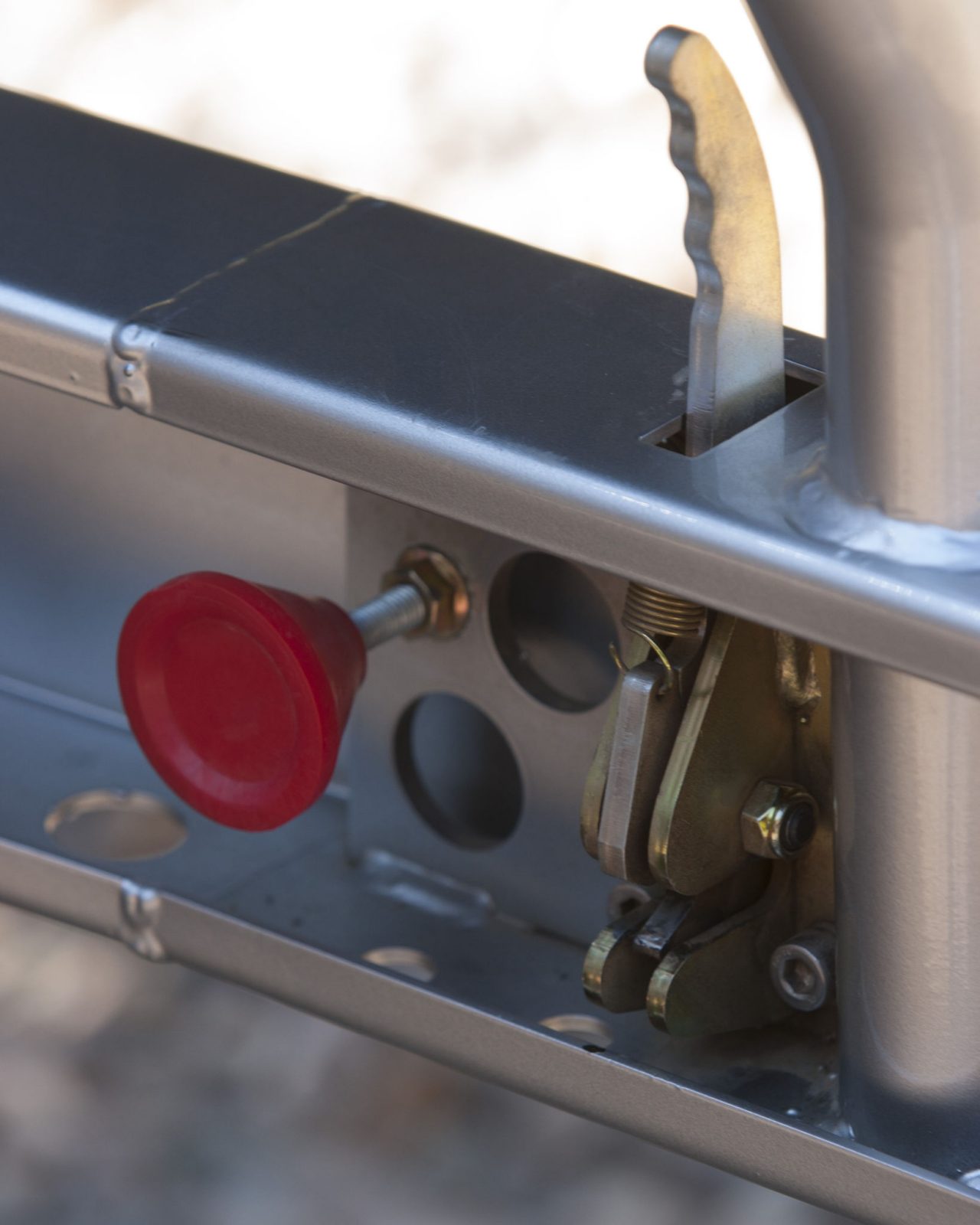 The carriers operate on gas struts that are sufficient to hold each side open in most situations. However, if the vehicle is on an extreme side angle, the locking pin can be engaged to ensure each side remains open.