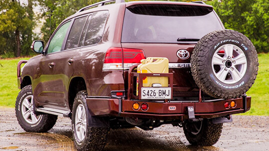 An ARB rear bar provides protection to the vehicle’s vulnerable rear panels whilst incorporating a heavy duty towing system or integrating with the factory towing system (model dependent). Giving owners the ability to relocate the spare tyre from either a rear door mount or from under the vehicle, the wheel carriers can be adjusted to suit different rim offsets and sizes along with increased tyre diameters. Removing the spare wheel from under the vehicle can also allow fitment of long range fuel tanks or additional fuel or water can be carried in the optional Jerry can holder.